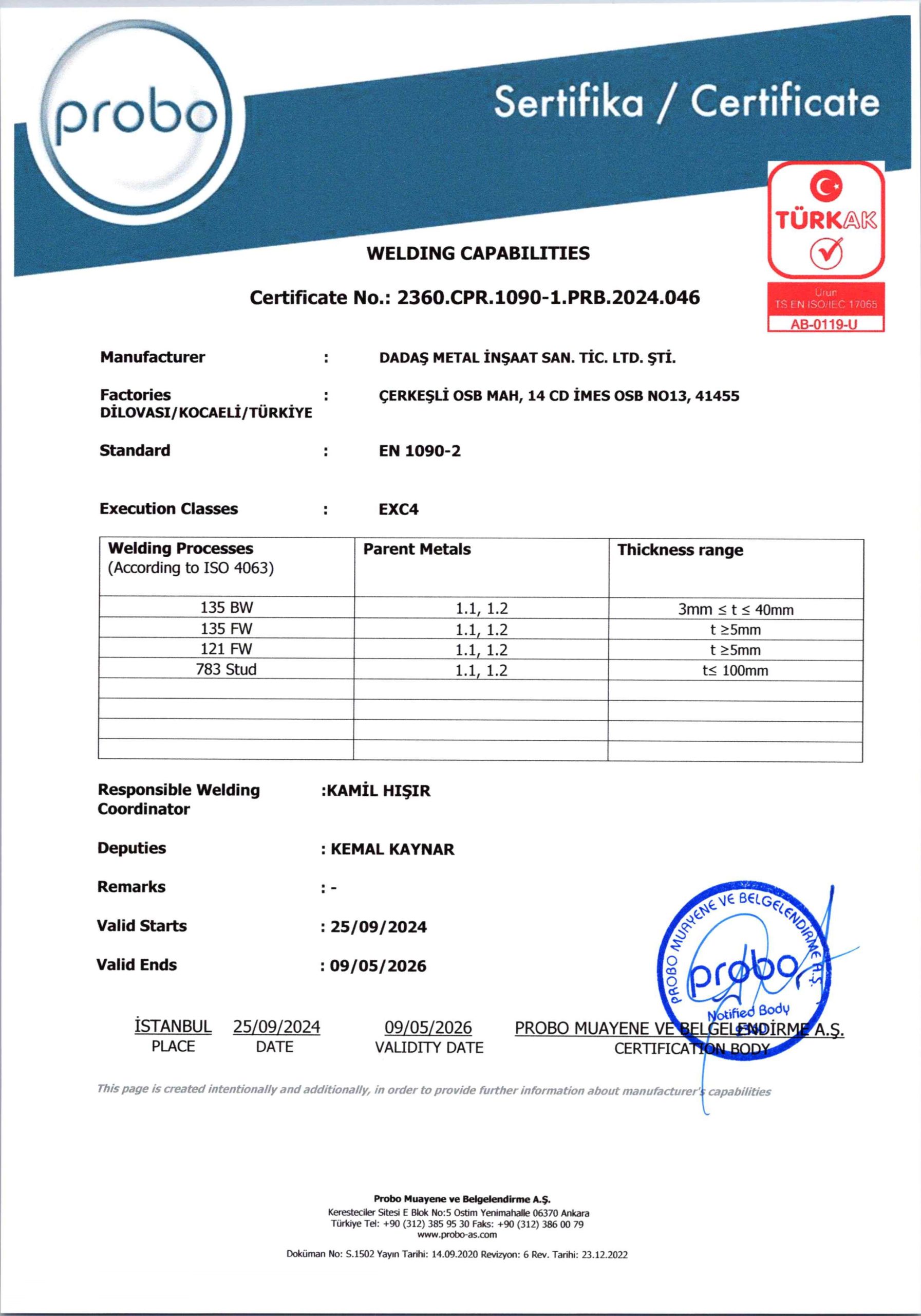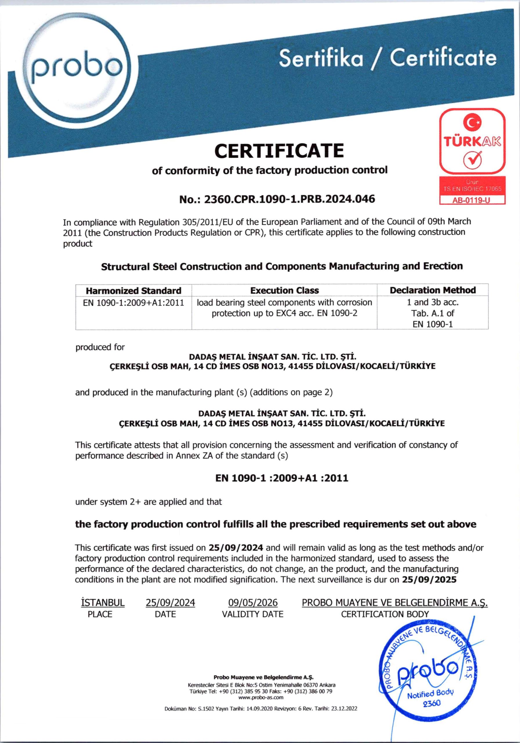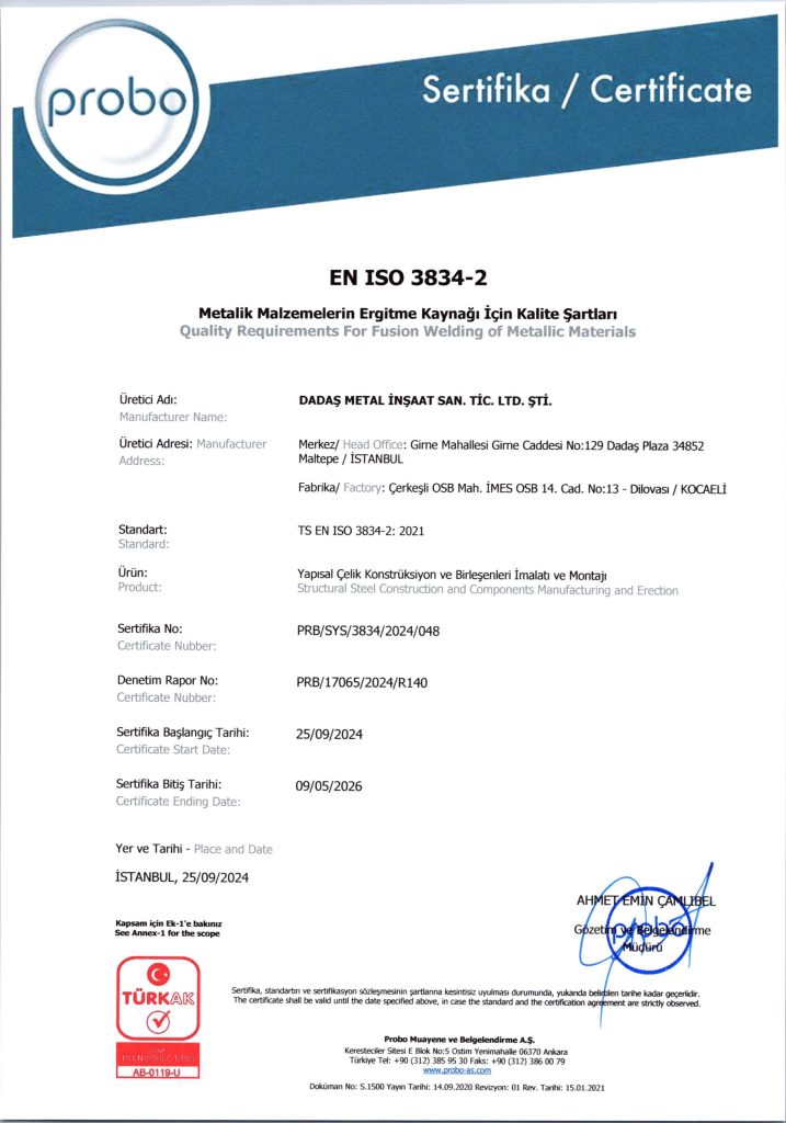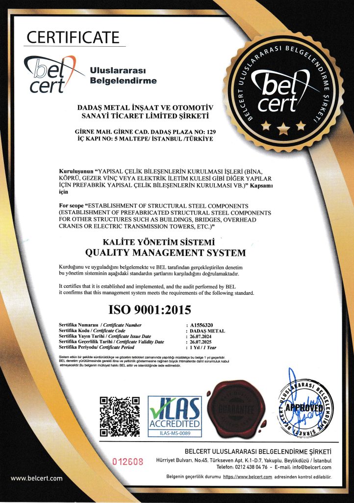 ISO EN 9001 Kalite Yönetimi, ISO EN 14001 Çevre Yönetimi, ISO EN 18001 İş Sağlığı ve güvenliği sertifikalarının yanında Avrupa Birliği ülkeleri tarafından talep edilen EN 1090/1 ve EN 1090/2 çelik yapı elemanları için tasarlanmış sertifikalar ayrıca Kaynaklı İmalatlara Uygunluk belgesi olan EN 3834 sertifikalarına sahibiz.