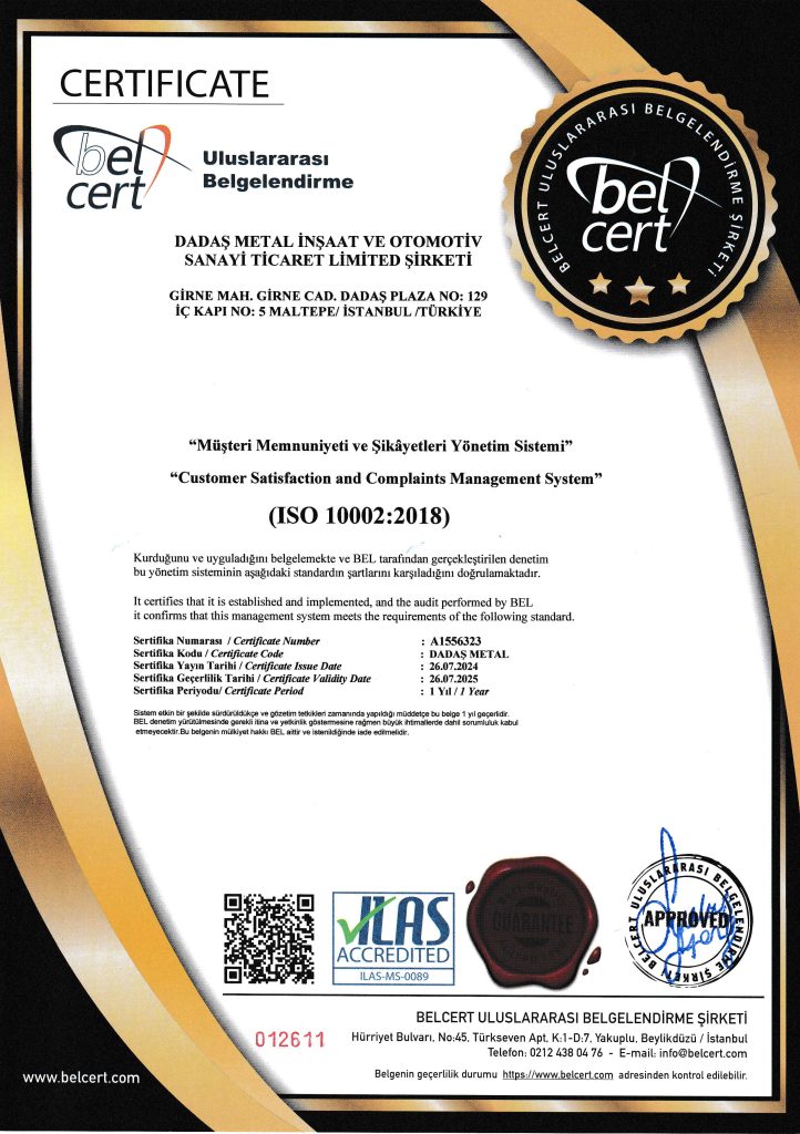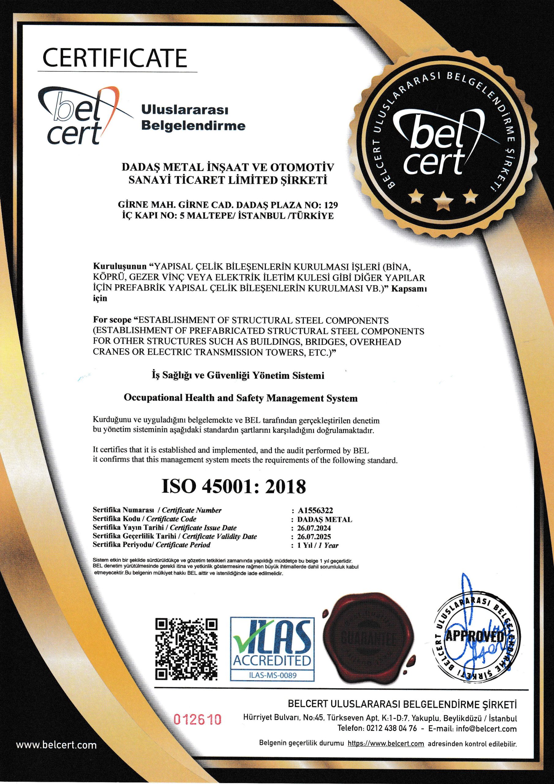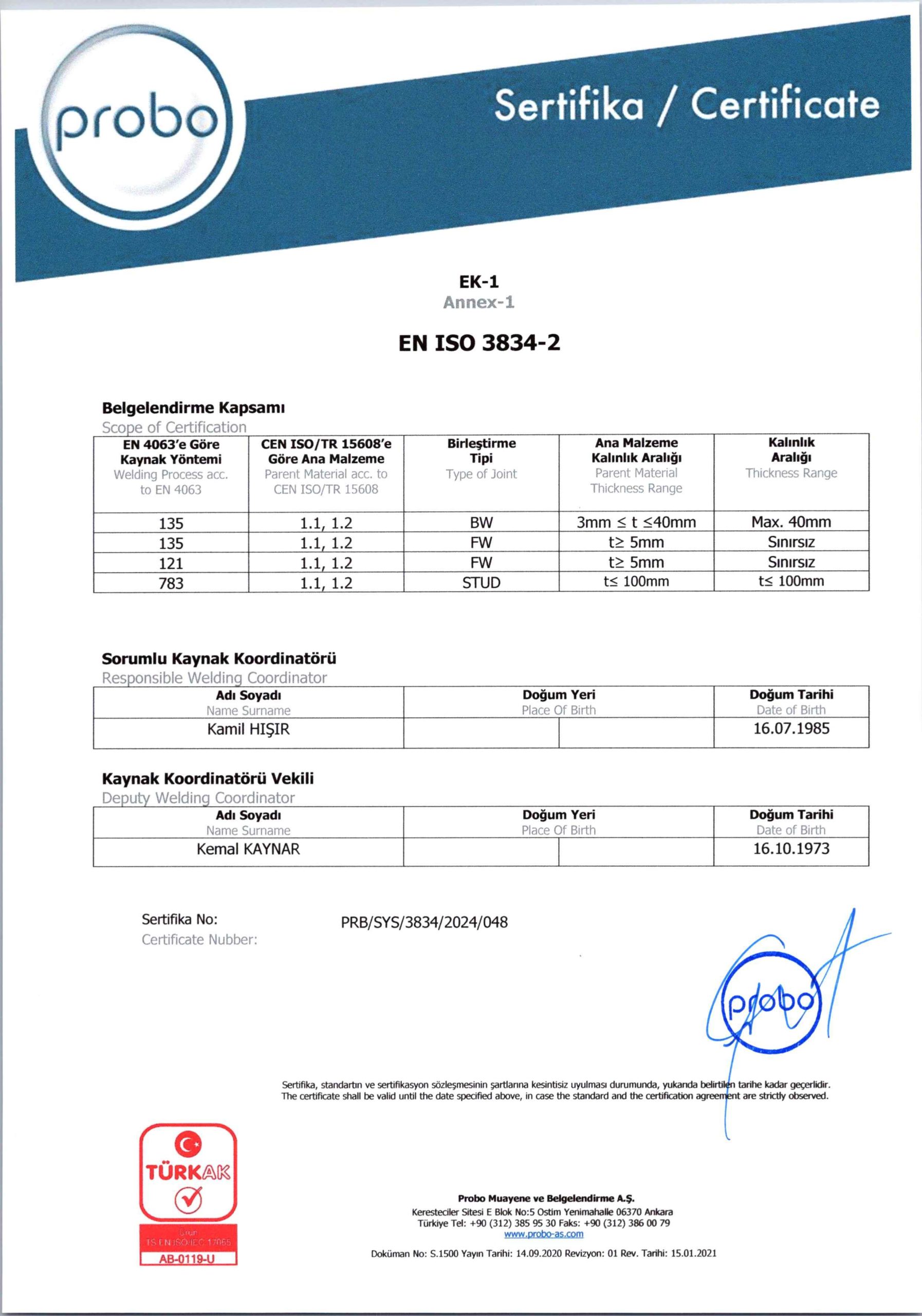 ISO EN 9001 Kalite Yönetimi, ISO EN 14001 Çevre Yönetimi, ISO EN 18001 İş Sağlığı ve güvenliği sertifikalarının yanında Avrupa Birliği ülkeleri tarafından talep edilen EN 1090/1 ve EN 1090/2 çelik yapı elemanları için tasarlanmış sertifikalar ayrıca Kaynaklı İmalatlara Uygunluk belgesi olan EN 3834 sertifikalarına sahibiz.